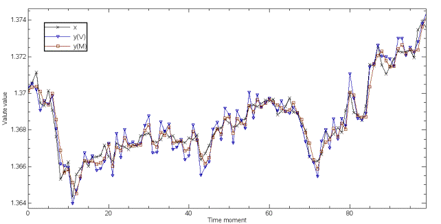 rates forecast by multilayer perceptron (y(M)) and by Volterry (y(V)).