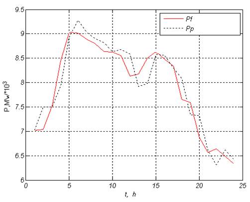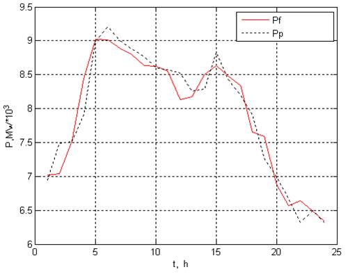 Рисунок 2. Фактическое (Pf) и прогнозируемое (Pp) электропотребление.