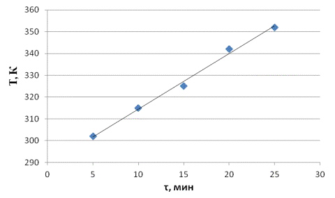 Рис. 1. Зависимость температуры раствора от времени озвучивания