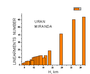 Длина линеаментов определялась в масштабе 1 см – 56 км по данным о максимальной длине вулканического потока 600 км от кратерного вала. Кратер Адамс имеет овальную форму размером 100 × 80 км. Гистограмма длин линеаментов кратера Адамс приведена в таблице и на рис. 1.