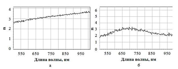 показателя преломления от длины волны образцов до (а) и после (б) анодирования