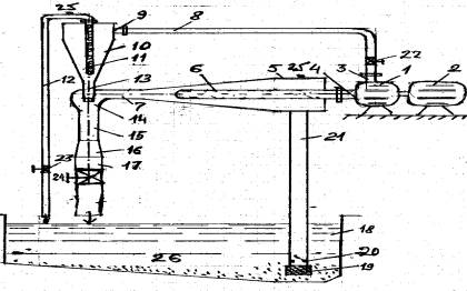 3-нагнетательный патрубок; 4-всас; 5-вакуумгидроциклон; 6-нефтеловушка; 7-сгуститель; 8-напорная труба; 9-
