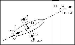 изображен момент пересечения НГП. Ось2 параллельна оси НГП. Преобразователи на крыльях ПЗ образуют ось a-b. Если соединить точку а с осью НГП получим треугольник с