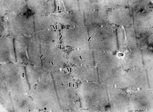 fibers in the area of discs I of muscle fiber sarcomeres. Lines Z, discs A,