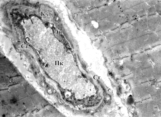 endomysium capillary (Кап) along with a still present perivascular edema (От) and the vacuolization of endotheliocyte cytoplasm