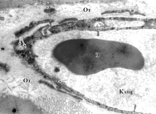 (arrows), an erythrocyte the capillary lumen (Э). 12,000 zoom