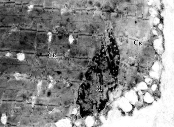 nuclei (Я) of muscle fiber with sarcomeres still present in the
