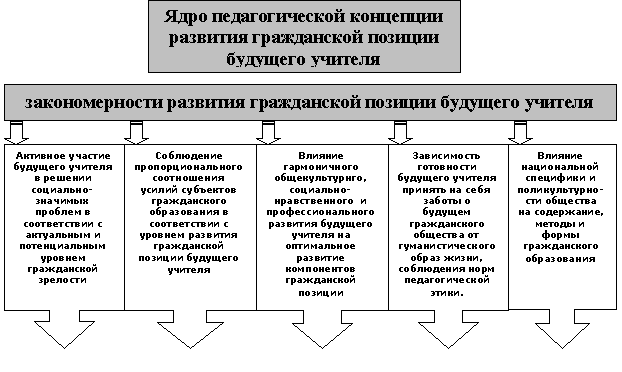 Таким образом, ядром педагогической концепции развития гражданской позиции будущего учителя мы называем систему исходных положений, определяющую особенности построения теории гражданского образования и характеризующих специфику развития гражданской позиции будущего учителя. Исходя из такого понимания, мы считаем, что ядро педагогической концепции в обязательном порядке должно включать закономерности и принципы развития гражданской позиции будущего учителя, позволяющие объяснить его сущность и обеспечить возможность теоретико-логического вывода всех положений педагогической концепции.