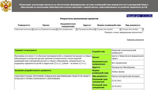страница «Результаты выполнения проектов» (рисунок 2). Пользователь выбирает