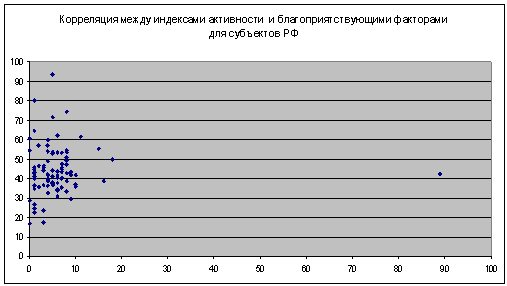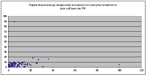 между индексами активности и результативности для субъектов РФ |