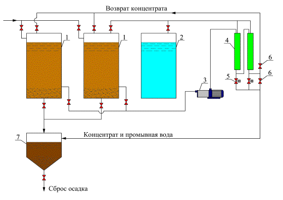 1 – баки сточной воды (или отстойники с тонкослойными модулями); 2 – бак очищенной воды; 3 – насос; 4 – мембранные аппараты; 5 – магнитные клапаны промывки; 6 – регулировочные вентили; 7 – отстойник