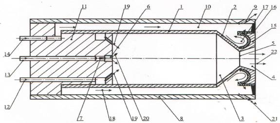 стенками камеры сгорания 1 и сопла Лаваля 2. В кожухе 8 выполнены отверстия 9, 21 для отвода охладителя 18.
