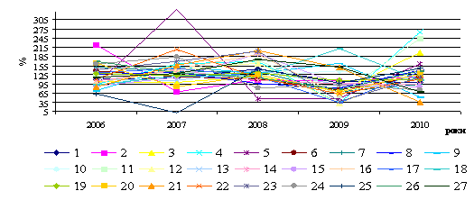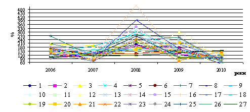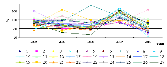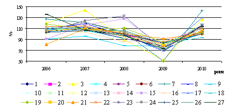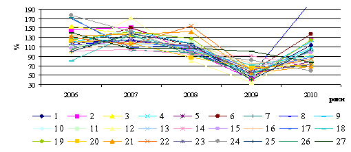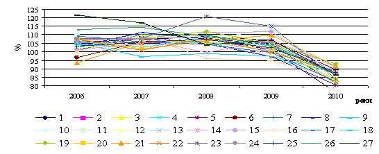 Як бачимо з даних, представлених на рис. 1-14, світова фінансова криза здійснила значний негативний вплив на соціально-економічний розвиток регіонів України. Так, практично на всіх рисунках можемо бачити різке зменшення у 2009 році (першому посткризовому році) темпів зростання таких ключових показників соціально-економічного розвитку регіонів держави як: валовий регіональний продукт (блок показників «реальний сектор» - рис. 1), обсяг промислової продукції (блок показників «реальний сектор» - рис. 2), обсяг сільськогосподарської продукції (блок показників «реальний сектор» - рис. 3), інвестиції в основний капітал (блок показників «інвестиційна та зовнішньоекономічна діяльність» - рис. 4), інвестиції у житлове будівництво (блок показників «інвестиційна та зовнішньоекономічна діяльність» - рис. 5), експорт та імпорт (блок показників «інвестиційна та зовнішньоекономічна діяльність» - рис. 7 і рис. 8), реальна заробітна плата (блок показників «соціальний сектор» - рис. 11), оборот роздрібної торгівлі (блок показників «споживчий ринок» - рис. 13) і споживчі ціни (блок показників «споживчий ринок» - рис. 14).