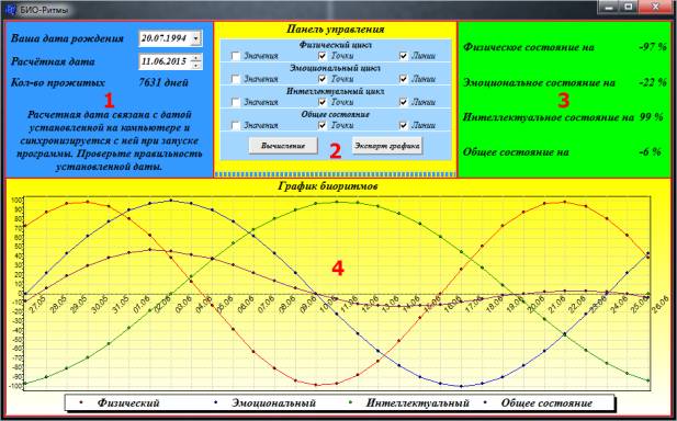 Нами разработана программа в среде разработки приложений Borland Builder 6.0 на языке программирования C++ «БИО-Ритмы». Интерфейс состоит из 4-х панелей (рис.1). В 1-ой панели задаются дата рождения и расчетная дата, а также отображается кол-во прожитых дней. Вторая панель – это панель управления. Она содержит выбор параметров для отображения графика, кнопку вычисления биоритмов и кнопку экспорта графика в изображение формата bmp. Третья панель – это панель отображения показателей всех рассчитанных биоритмов на расчетный день. И четвертая панель – это панель графического представления биоритмов на 31 день.
