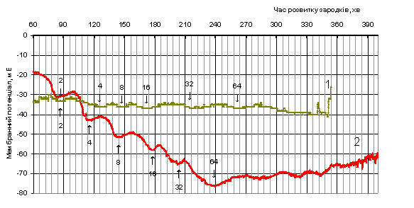 порівнянні двох кривих, можна помітити, що періоди першого (2 бластомери) та