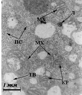 – мультивезикулярні тільця; МХ – мітохондрії; ПС – полісоми; ТВ – травні