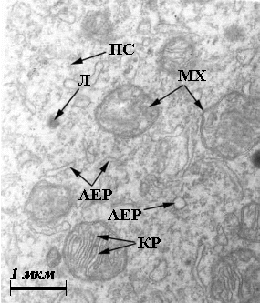 М (г): АЕР – агранулярний ЕПР; ГЕР – гранулярний ЕПР; ЖГ – жовткові гранули;