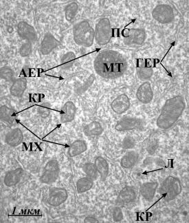 КГ – комплекс Гольджі; КР – кристи мітохондрій; Л – лізосоми; М– моносоми; МТ