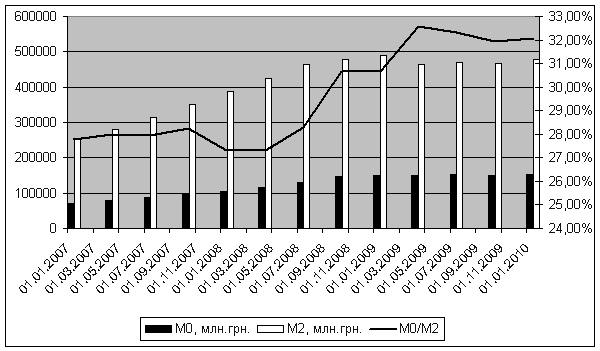 Рис. 2. Співвідношення динаміки агрегатів М0, М2 та М0/М2, млн. грн.