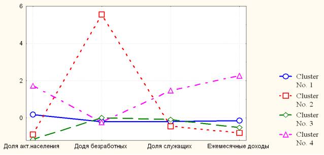 среднедушевого дохода в рублях. Кластерный анализ в пакете STATISTICA разбил регионы на четыре кластера с центрами, приведёнными на рис. 1.