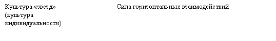 4. Индивидуальная культура (или культура «звезд»), где каждый человек (или подразделение) является «звездой». Такой тип культуры свойственен организациям, созданным несколькими специалистами для совместного использования ресурсов. При этом участники объединения работают практически самостоятельно, не взаимодействую друг с другом. Недостатком является неуправляемость или слабая управляемость работников/организации, которая может фактически отсутствовать.