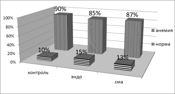 Критерий достоверности для уровня гемоглобина: t(эндо) = 0.28, t(сма) = 1.6, что говорит об отсутствии различий среди