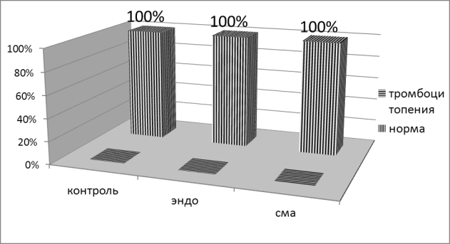 Критерий достоверности для количества тромбоцитов: t(эндо) = 0.81, t(сма) = 0.70, что говорит об отсутствии различий среди