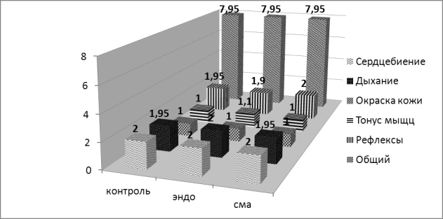 показателя шкалы Апгар на 1-ой минуте: t(эндо) = 0, t(сма) =