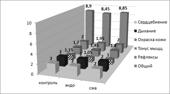 показателя шкалы Апгар на 5-ой минуте: t(эндо) = 3.75, t(сма) = 0.7, что подтверждает обнаруженные различия.