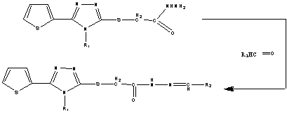 Рис.1 Схема отримання іліденгідразидів 2-(4-R-5-(тіофен-2-іл)-4Н-1,2,4-тріазол-3-ілтіо)ацетатних кислот (де R - H, CH3, C2H5, C6H5)