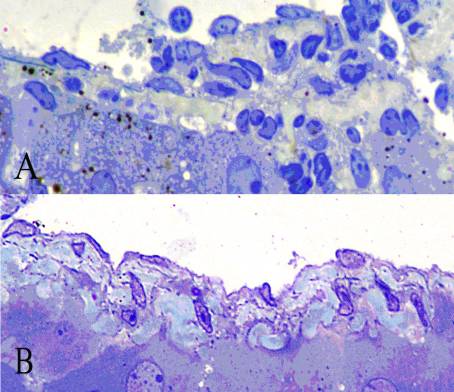 Гидропическая дистрофия и пикноз ядер эндотелиоцитов. Полутонкий срез.