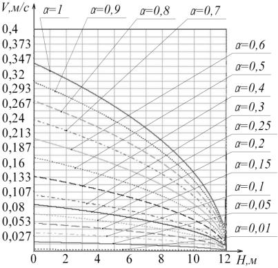 Графики зависимости скорости от высоты при разных степенях открытия задвижки,
