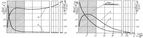Рис.2. Экспериментальные данные по шинам: амплитудные частотные (1,3) и фазовые частотные (2,4) характеристики