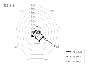 от 0,18 у завезённых герефордов (ГРФ_АВСТР) до 0,4 у ГРФ_F1 и 0,6 у ГРФ_РФ_F2. Частоты аллеля 215 локуса ETH10 и аллеля 264 локуса BM1818