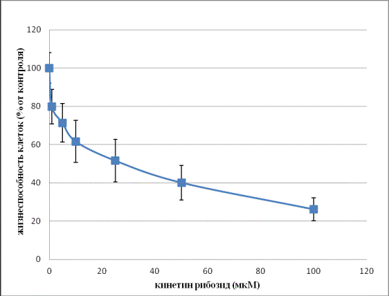 Из рис. 1 видно, что кинетинрибозид оказывает достоверное антипролиферативное действие на клетки HeLa. Концентрация кинетинрибозида, которая вызывает 50%