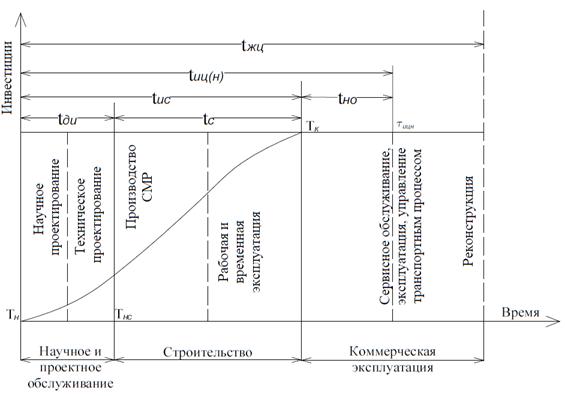 объекта (железной дороги, автодороги и др.): Тн — начало инвестирования проекта; tжц