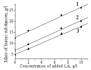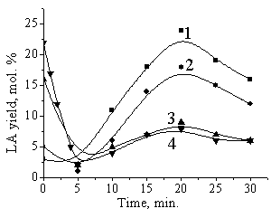 LA concentration on the yield of humic substances in fructose conversion (1080C,