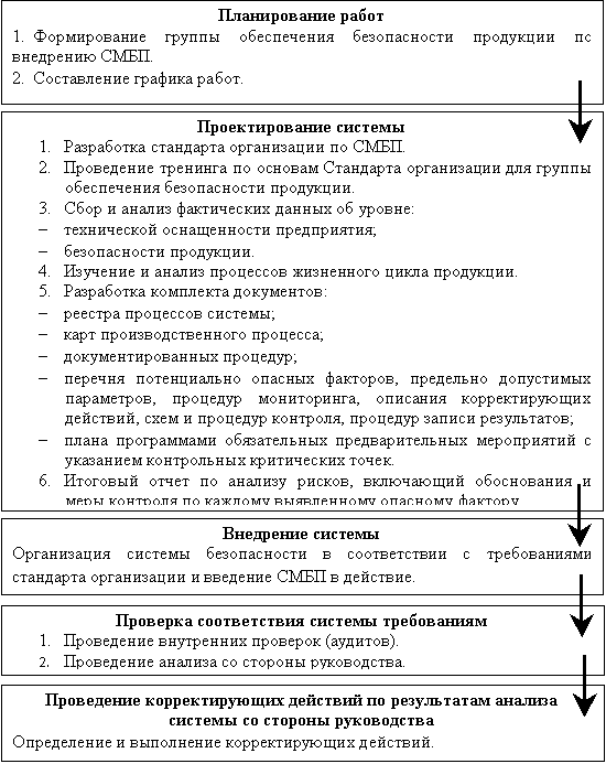 Так как технические регламенты вводятся впервые, нет четкого представления о способах выполнения их требований. В этой связи становится актуальным вопрос о создании системы, сертификация которой подтверждала бы возможности предприятия к выполнению требований данных регламентов. В качестве прототипа такой системы может быть использована система менеджмента безопасности продуктов питания (СМБПП), разработанная на основе международных стандартов. Последовательность действий по разработке СМБП приведена на рис. 1.