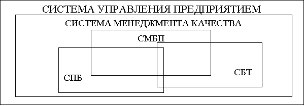 Как плавило, организации стремятся к созданию интегрированных систем управления. В этой связи система менеджмента безопасности продукции (СМБП) вместе с системой промышленной безопасности (СПБ), системой безопасности труда (СБТ) и системой менеджмента качества (СМК) могет быть объединена в единую интегрированную системы управления предприятием (рис. 2).