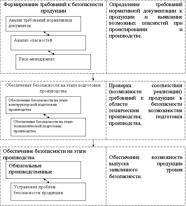 Для обеспечения выполнения функций СМБП и ее применения в составе интегрированной системы управления все процессы следует разделить на четыре категории: деятельность руководства в СМБП; основные процессы СМБП; вспомогательные процессы; измерение, анализ, улучшение. Основные этапы обеспечения безопасности продукции представлены на рис. 3. В процессе анализа требований нормативных документов применяются такие методы как QFD, позволяющий перевести выбранные требования в конкретные характеристики продукции, FMEA-анализ, позволяющий, в рамках «анализа опасностей», оценить вероятность проявления того или иного отказа в продукции и его влияние на безопасность. В процессе риск-менеджмента выявляется соотношение результатов анализа опасностей и возможности по минимизации (устранению) их. В этой связи и происходит объединение риск-менеджмента и анализа опасностей в один блок «определение риска производства».