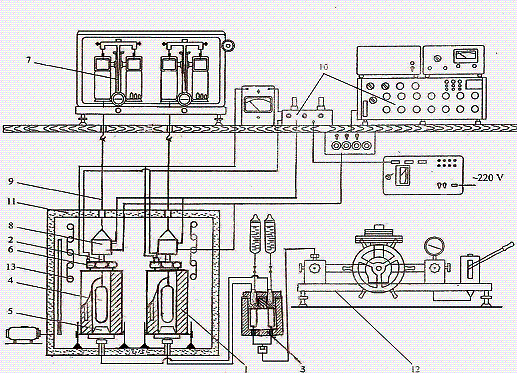 грузопоршневой манометр МП-60 (12), электронагреватель (13).