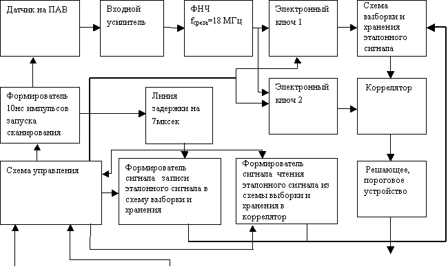 на ВШП1 и этот импульс поступает на линию задержки на 7мкс. Возбужденная ПАВ движется в подложке датчика [ 5] и