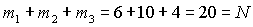 словами, N=20, l1=5, l2=7, l3=11, m1=6, m2=10, m3=4. Как видно,