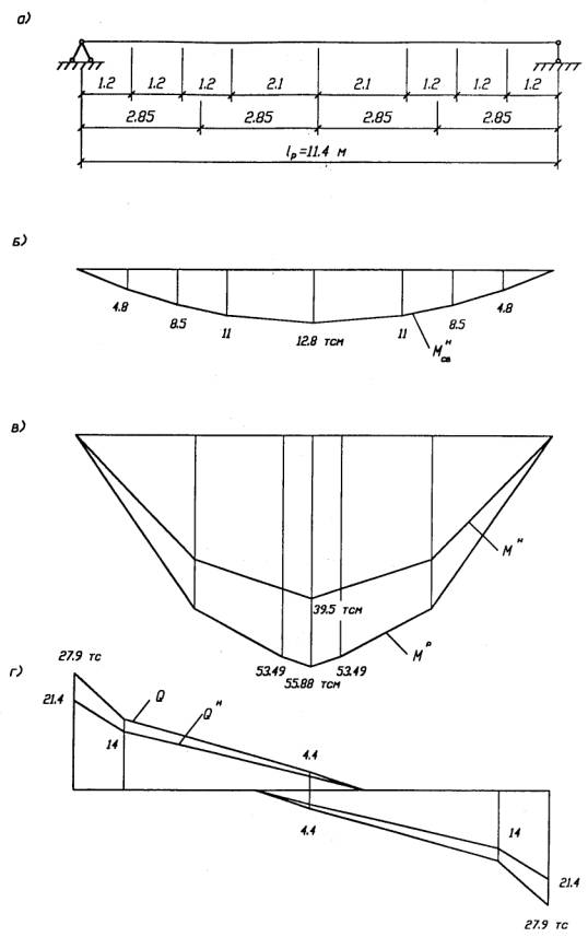 Рис. 2 Расчетная схема плиты (а) и принятые в расчете огибающие эпюры изгибающих моментов (б, и) и поперечных сил (г):