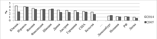 Расходы на НИОКР по странам, в 2005 г. и в 2014 г., в % к ВВП