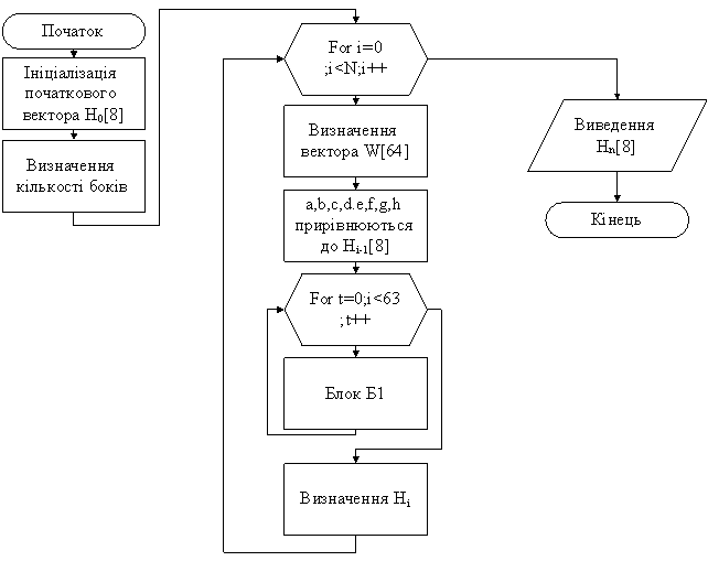 H[0] = 6A09E667H[1] = BB67AE85H[2] = C6EF372H[3] = A54FF53AH[4] = 510E527FH[5] = 9B05688CH[6] = 1F83D9ABH[7] = 5BE0CD19Для вихідного повідомлення l довжина ділить на 512, В кінець повідомлення додається «1», після чого додається така мінімальна кількість нулів k, щоб виконувалась рівність l+1+k=448 mod 512. В останні 64 біти заноситься довжина повідомлення [1].