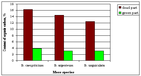 short dense (or friable) turf B. caespiticium and B. argenteum. The lowest indices of organic carbon content have been determined on