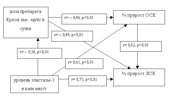р<0,01; Креон/%ЛСК r=-0,49; р<0,01) (рисунок 4).
