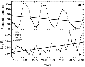 от 1973 к 2011 гг. солнечная активность уменьшалась, а сейсмическая энергия