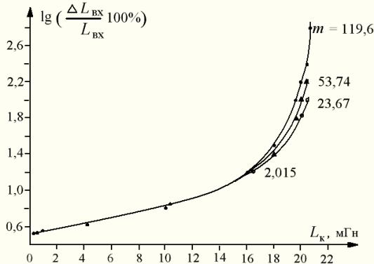 компенсирующей Lк для разных значений коэффициента умножения m. Видно, что значение Lк существенно увеличивает относительное приращение, так, при Lк = 0 ΔLвх/ Lвх = 3,37%, а при воз-